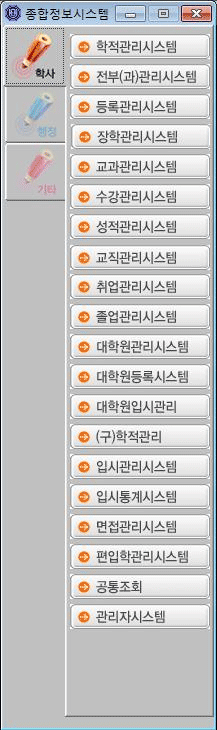 현황 열린 미래 꿈이있는 대학, 동아대학교 메인으로 이동 현황 현황 연혁 자료실 닫기 정보시스템 구축현황 조직도 정보시스템 구축현황 전화번호 안내 찾아오시는 길 닫기 학사관리시스템 학사관리시스템 행정관리시스템 교직원정보시스템 동아대학교 홈페이지 닫기 현황 현황 조직도 정보시스템 구축현황 학사관리시스템 행정관리시스템 교직원정보시스템 동아대학교 홈페이지 전화번호 안내 찾아오시는 길 학사관리시스템 행정관리시스템 교직원정보시스템 동아대학교 홈페이지 정보시스템 구축현황 SNS 목록열기 FACEBOOK 공유하기 TWITTER 공유하기 BLOG 공유하기 SNS 목록닫기 인쇄 url 복사 학사관리시스템 행정관리시스템 교직원정보시스템 동아대학교 홈페이지 동아대학교 종합정보시스템은 [학사/행정]에 관한 모든 작업을 할 수 있으며 각각의 데이터베이스는 사용 권한이 있는 분만이 액세스가 가능합니다. 각 메뉴에 대한 설명을 보시려면 아래 그림을 클릭해 주십시오. 구분학사정보시스템업무명입시, 학적, 교과관리, 시간표, 수강신청, 강의시수, 강의시간표, 교직, 성적, 졸업, 등록, 장학, 취업, 대학원, 증명발급, 졸업생관리, 문자전송, 평생지도교수제, OMR관리 <p> <strong>동아대학교 종합정보시스템은 [학사/행정]에 관한 모든 작업을 할 수 있으며 각각의 데이터베이스는 사용 권한이 있는 분만이 액세스가 가능합니다. <br>각 메뉴에 대한 설명을 보시려면 아래 그림을 클릭해 주십시오.</strong></p><hr/><TABLE border=0 width="100%" bgColor=#eeeeee> <TBODY> <TR> <TD bgColor=#ffffff> <P align=center> <TABLE border=0 > <TBODY> <TR> <TD width=190 rowspan="2"><IMG border=0 src="/sites/info/images/sub1_02_01.gif" useMap=#Map></TD> <TD width=10 rowspan="2"> </TD> <TD valign="top"> <p align="center"><IMG src="/sites/info/images/sub1_02_01_04.gif" border=0 width="97%"></p></TD> </TR> <TR> <TD valign="top"><TABLE border=1 bordercolor="#FFFFFF" bgColor="#eeeeee" width="100%"> <TBODY> <TR> <TD class="dash-style"> <OL> <LI>성적시스템은 크게 성적처리, 진행현황, 성적검색 등으로 구성하여 성적업무의 전 과정을 정확하고 신속하게 관리할 수 있도록 하였다. </LI> <LI>성적입력업무에서 입력 후 즉시 입력결과 확인이 가능하고, 성적정정시 오류발생 요인을 자동처리 하였다. </LI> <LI>편입학생의 성적을 인정하고, 다양한 성적정보 검색기능과 보고서발행기능을 강화하였다. </LI> </OL></TD> </TR></TBODY></TABLE></TD> </TR> </TBODY> </TABLE> </P> </TD> </TR></TBODY></TABLE> <hr/><MAP name=Map><AREA href="http://dms.donga.ac.kr/info/5028/subview.do" shape=RECT target="self" coords=70,33,208,57><AREA href="http://dms.donga.ac.kr/info/5029/subview.do" shape=RECT target="self" coords=70,95,210,120> <AREA href="http://dms.donga.ac.kr/info/5030/subview.do" shape=RECT target="self" coords=72,125,211,150><AREA href="http://dms.donga.ac.kr/info/5031/subview.do" shape=RECT target="self" coords=71,156,210,178><AREA href="http://dms.donga.ac.kr/info/5032/subview.do" shape=RECT target="self" coords=70,184,210,209><AREA href="http://dms.donga.ac.kr/info/5033/subview.do" shape=RECT target="self" coords=70,214,209,239><AREA href="http://dms.donga.ac.kr/info/5034/subview.do" shape=RECT target="self" coords=71,245,211,271><AREA href="http://dms.donga.ac.kr/info/5035/subview.do" shape=RECT target="self" coords=69,275,209,298><AREA href="http://dms.donga.ac.kr/info/5036/subview.do" shape=RECT target="self" coords=70,304,210,329><AREA href="http://dms.donga.ac.kr/info/5037/subview.do" shape=RECT target="self" coords=70,335,210,359><AREA href="http://dms.donga.ac.kr/info/5038/subview.do" shape=RECT target="self" coords=70,365,209,389><AREA href="http://dms.donga.ac.kr/info/5039/subview.do" shape=RECT target="self" coords=68,575,209,600></MAP><MAP name=Map2>
